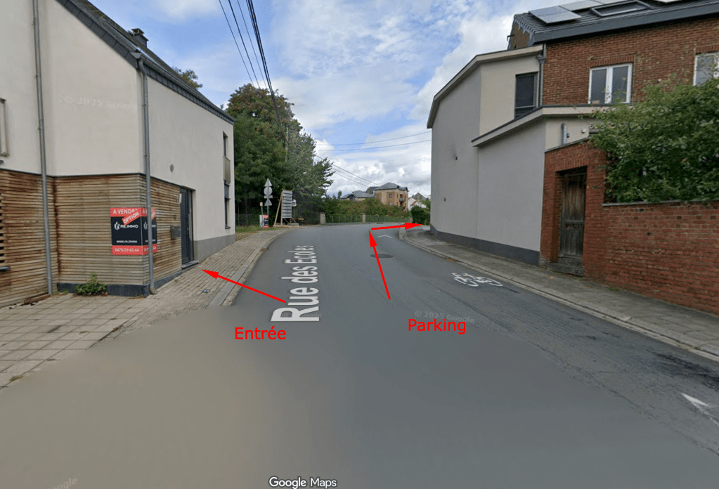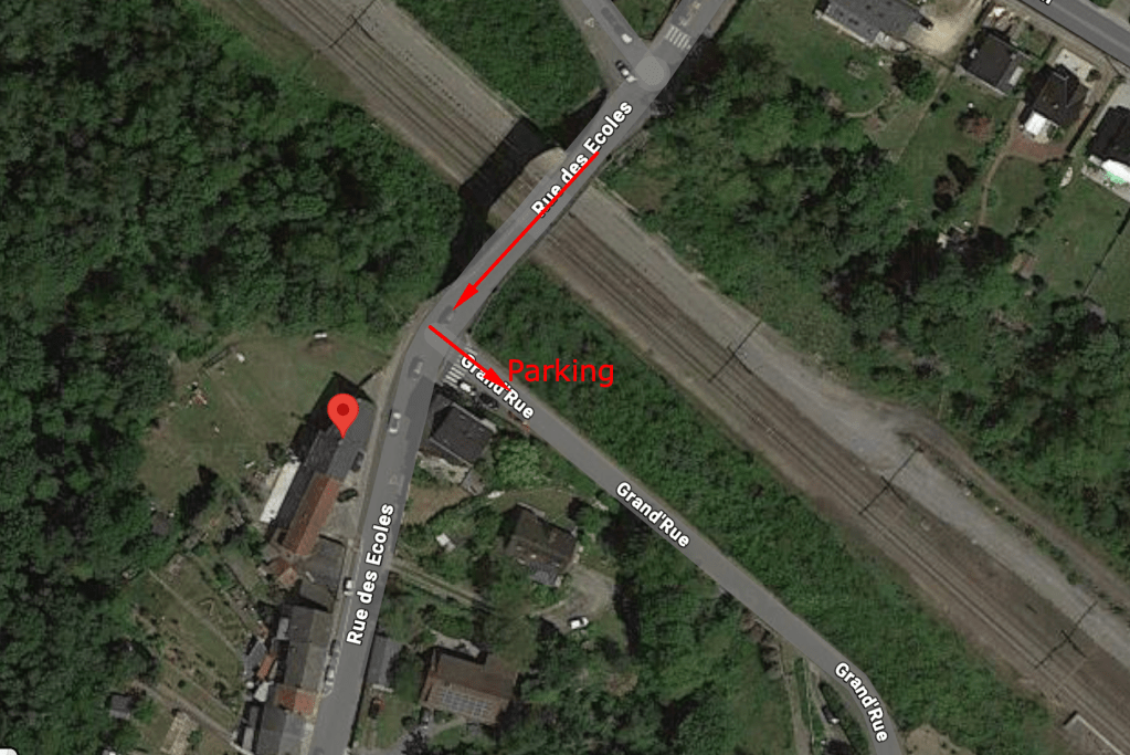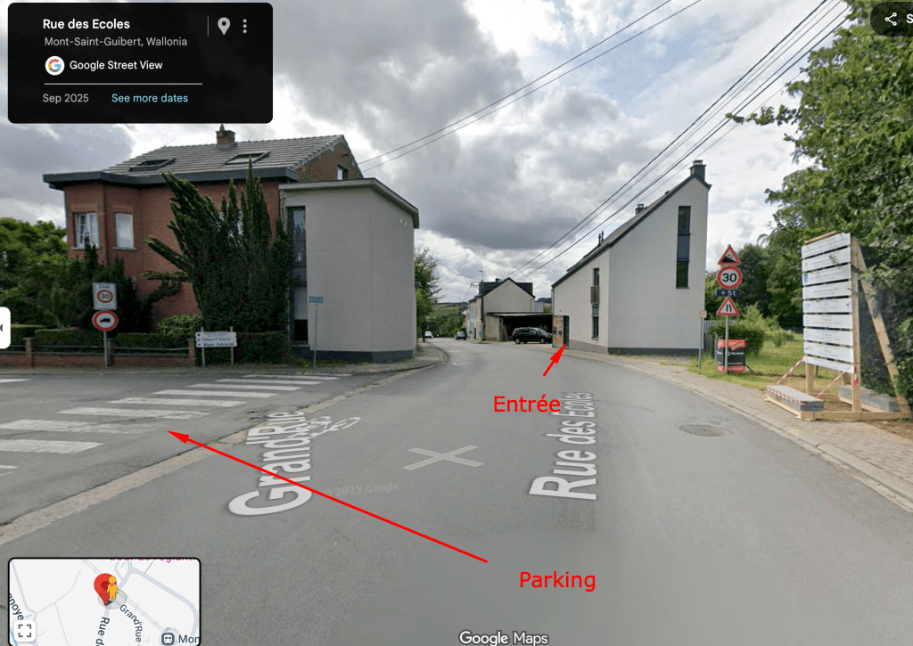 Parking : à gauche juste après le pont, en venant de la N25 ou E411, ou à droite en haut de la côte, en venant du centre de Mont-Saint-Guibert